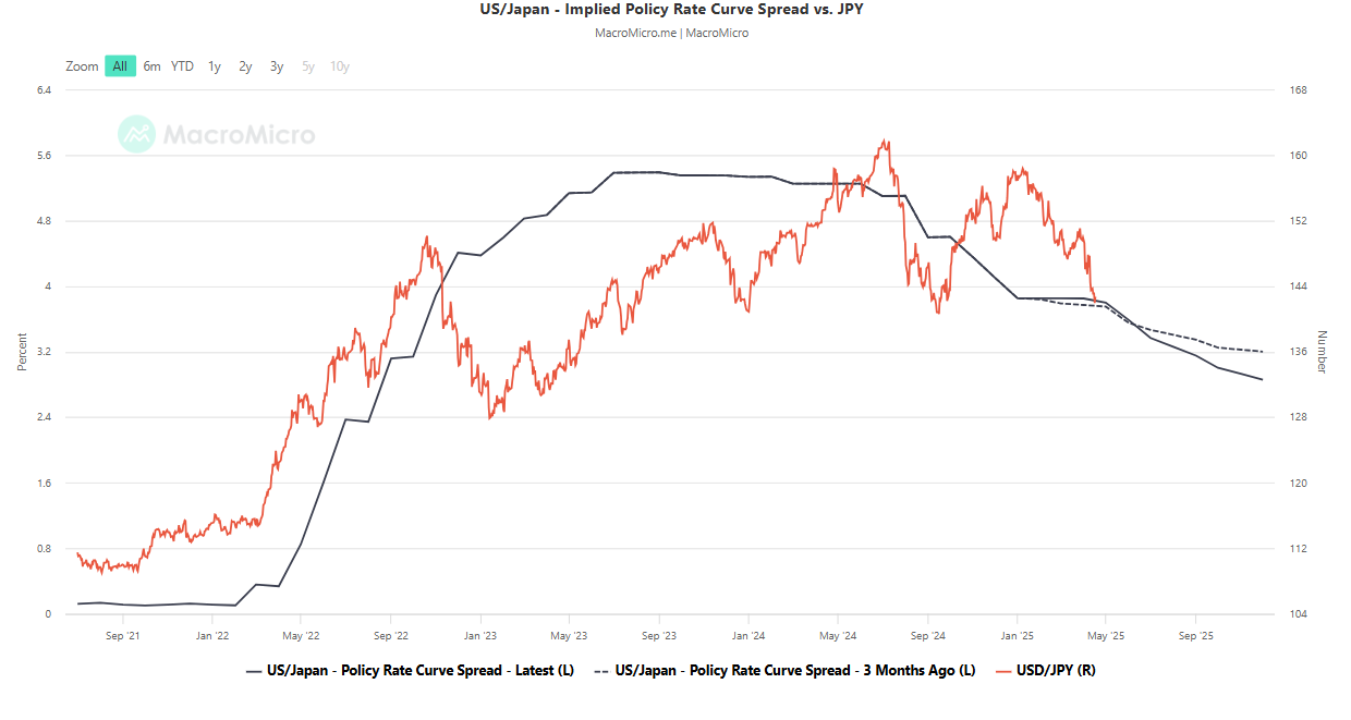 The implied interest rate differential between US and Japan policy interest rates, projected to December 2025 via short-term rate futures, has narrowed to 2.86% from 3.20% three months ago.