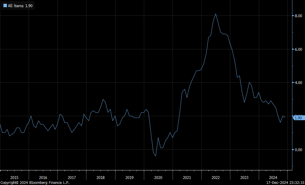 According to Bloomberg’s analyst surveys, the disinflation process will resume slowly in 2025. Specific contributors, such as insurance and healthcare, are also forecasted to remain at their current levels and may increase. The US CPI is predicted to be at 2.4% in 2025, compared to its average of 2.9% in 2024. Meanwhile, Core PCE is forecasted to drop further in 2025 to 2.3% compared to its 2024 average of 2.8%.